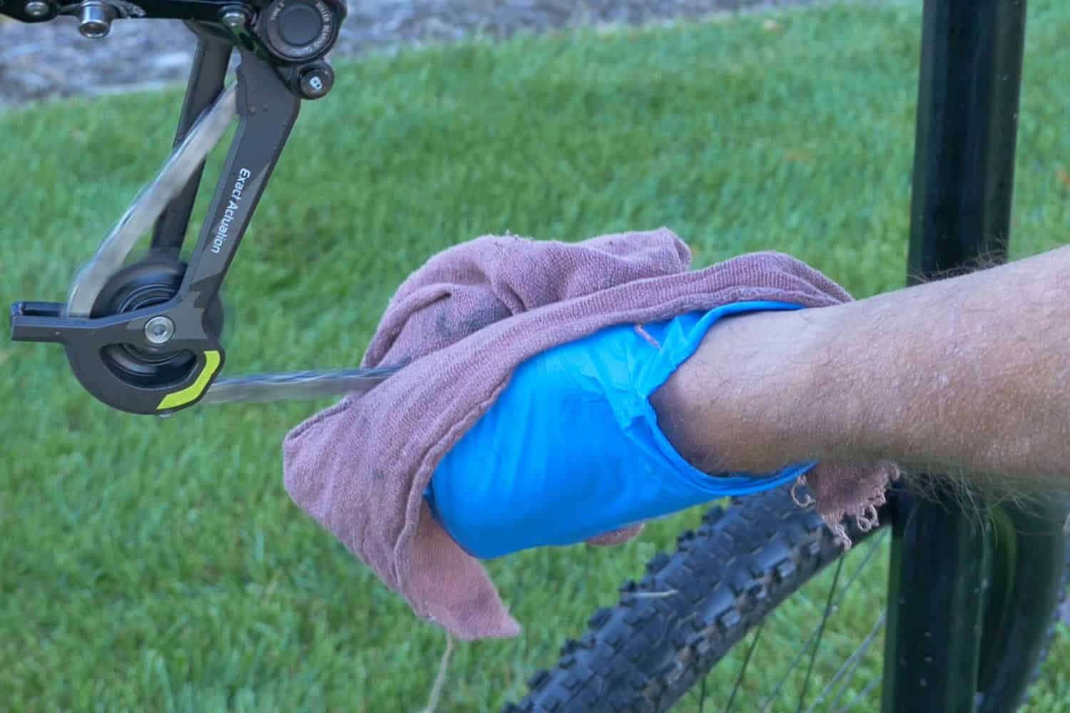 - Rantai sepeda perlu dikeringkan, karena setelahnya akan dilumasi ulang, kalau masih banyak air, pelumas tidak akan masuk ke dalam celah-celah rantai sepeda. Bungkus rantai sepeda dengan kain kering, dan tahan menggunakan tangan, sambil memutar pedal untuk menjalankan rantai sepeda lakukan beberapa putaran, sampai rantai kering.