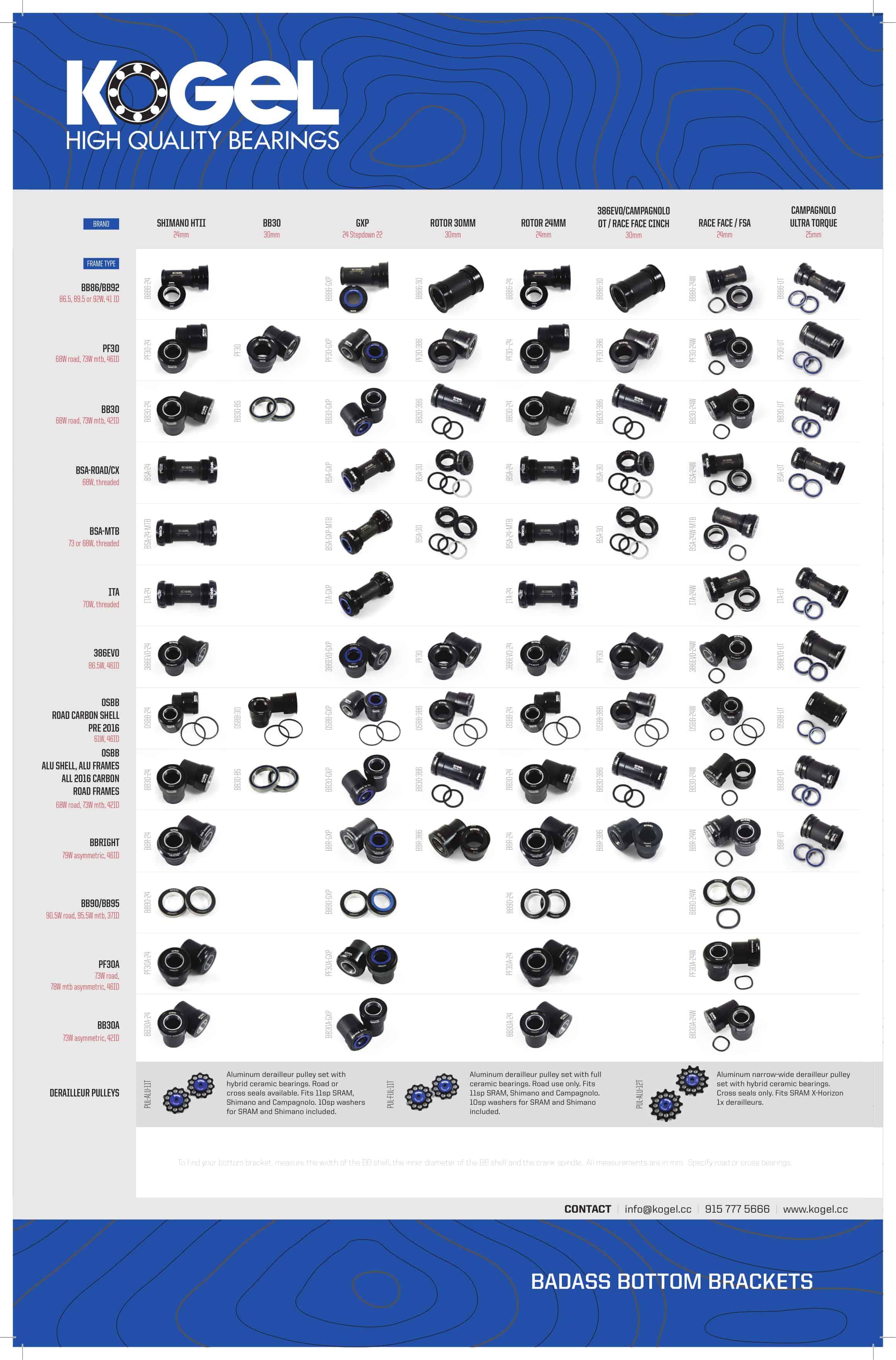 Tidak ada standard baku untuk bottom bracket sepeda, setiap pabrikan bisa membuat jenis BBnya sendiri. Jenis yang beredar banyak sekali dan akan terus bertambah, membuat kita pengguna kadang bingung untuk memilih bottom bracket dan komponen lain agar bisa cocok. Baca terus ke bawah untuk melihat kecocokan bottom bracket dan komponen lainnya.
